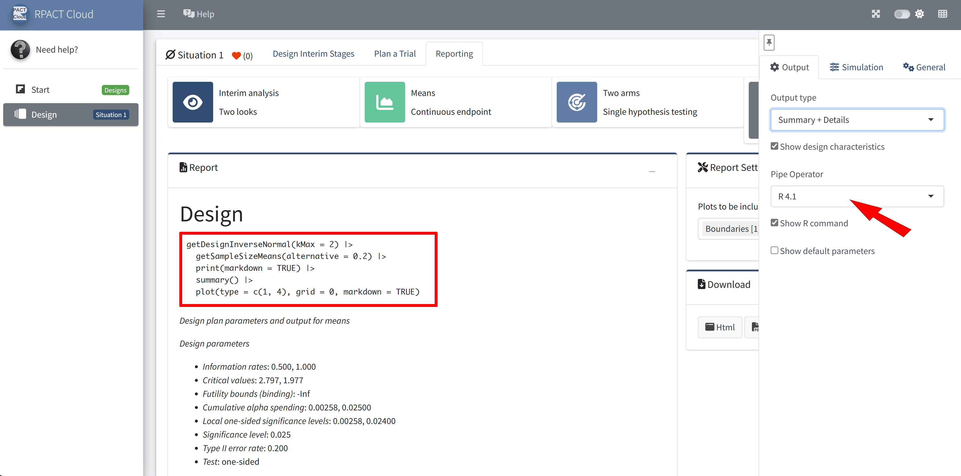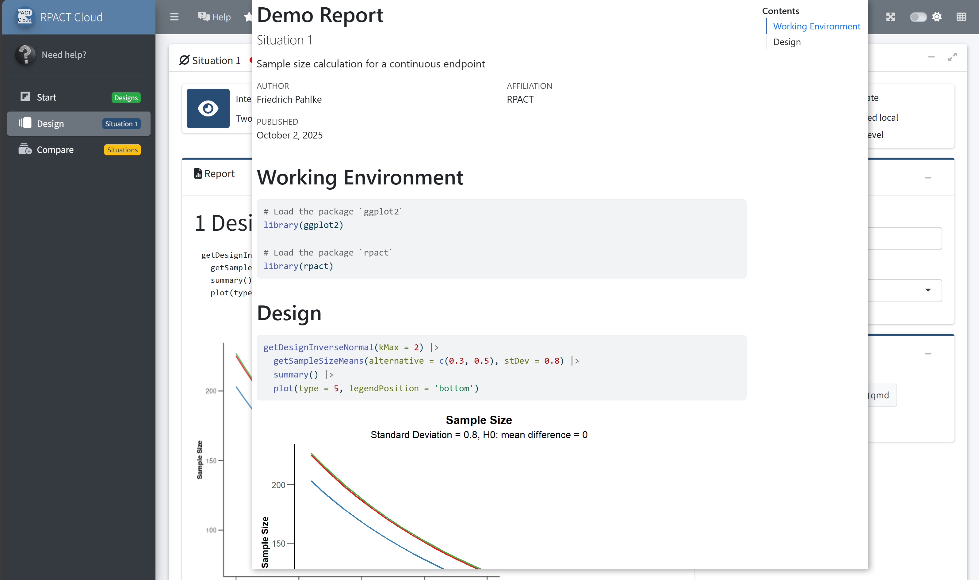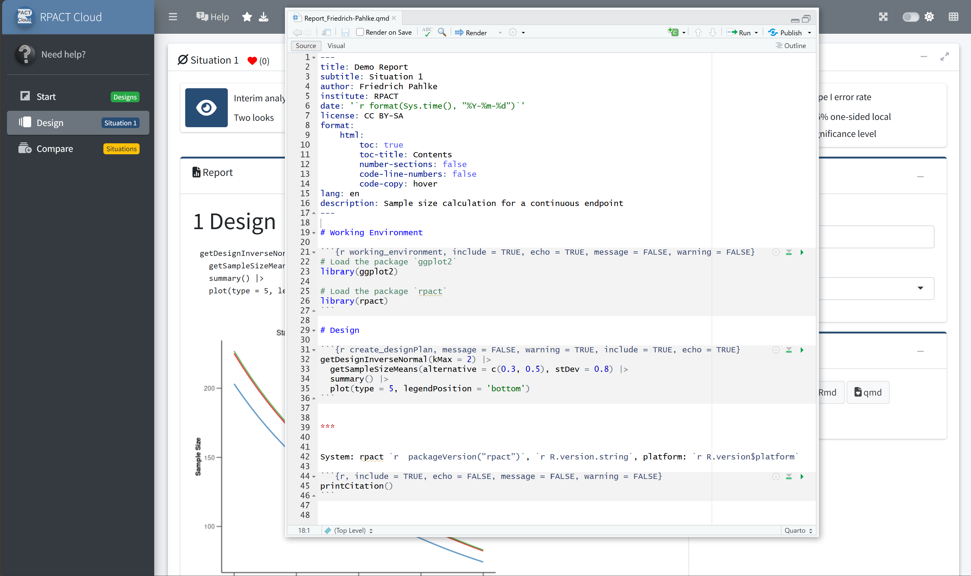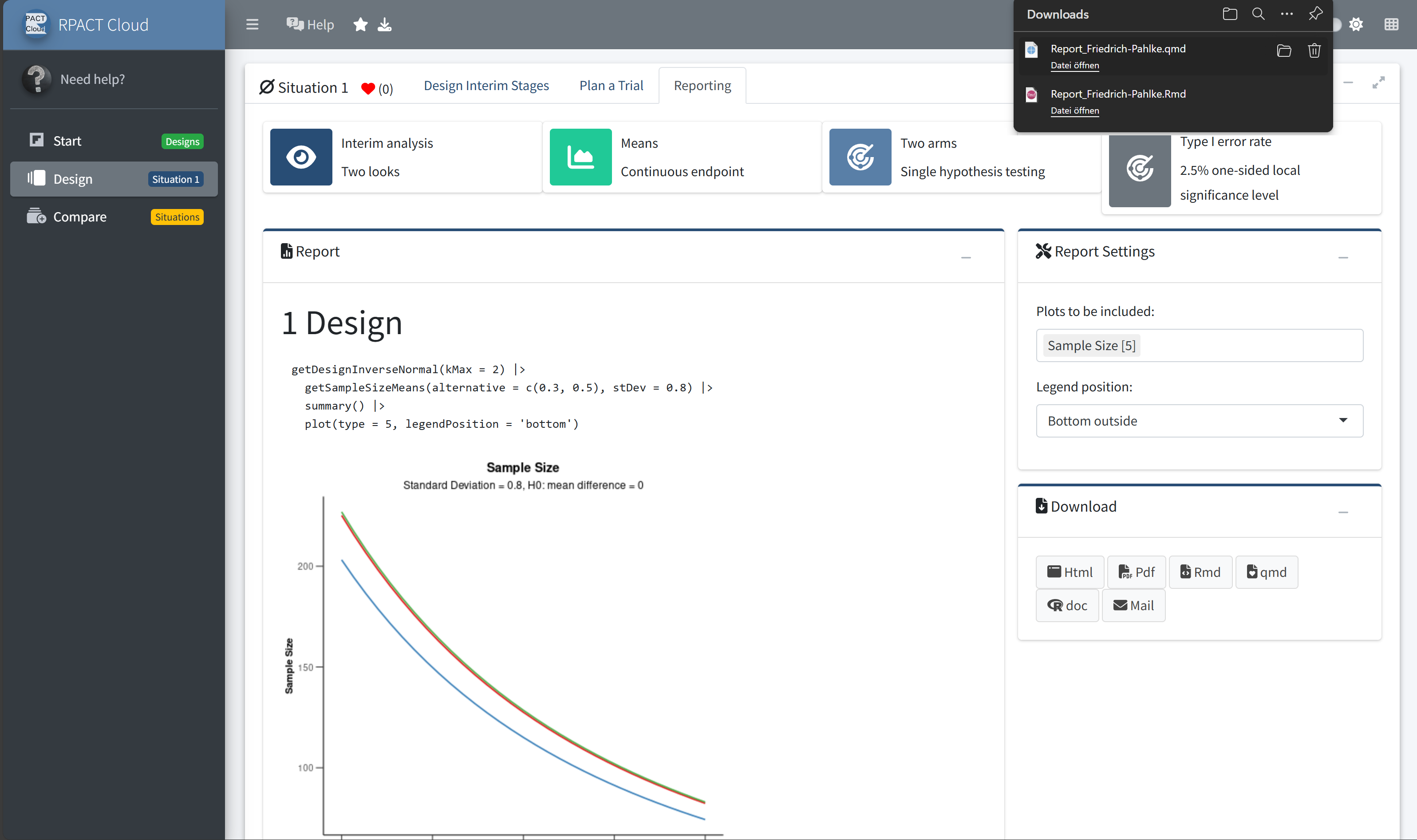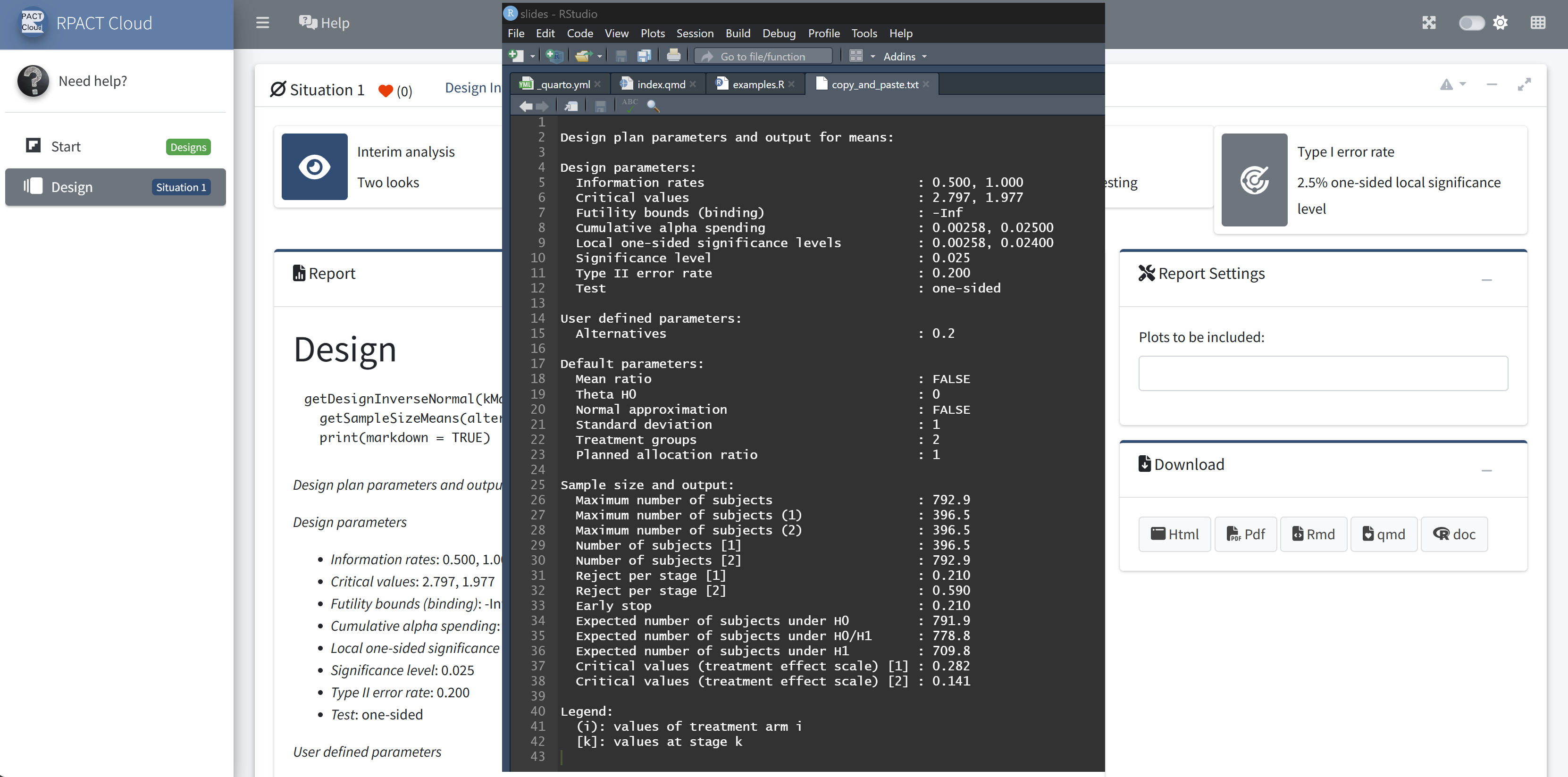 - Code-based: RPACT Cloud produces R code that can be exported as part of reports, and can then be fully transparently version-controlled, reviewed and audited, and can be used for regulatory submission purposes
