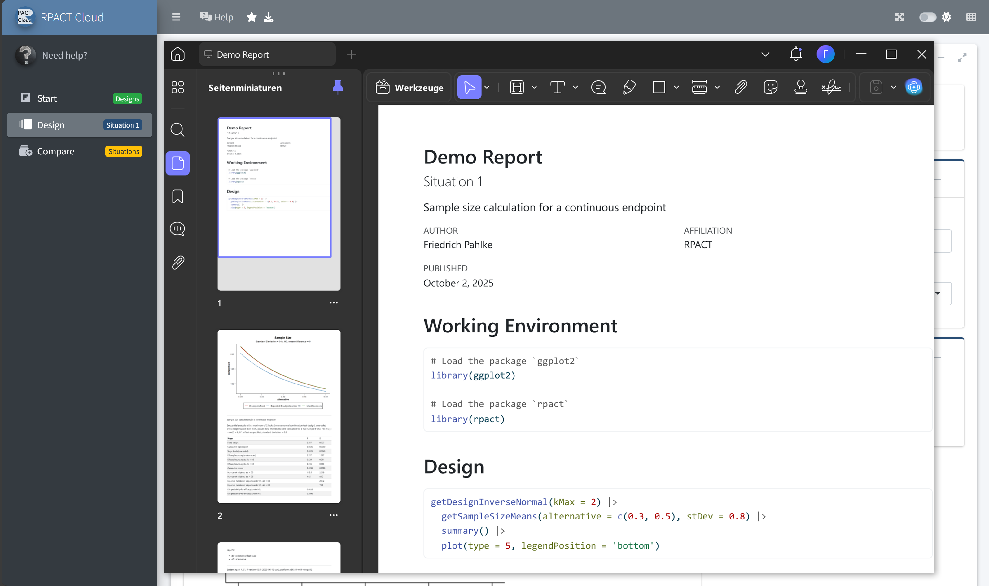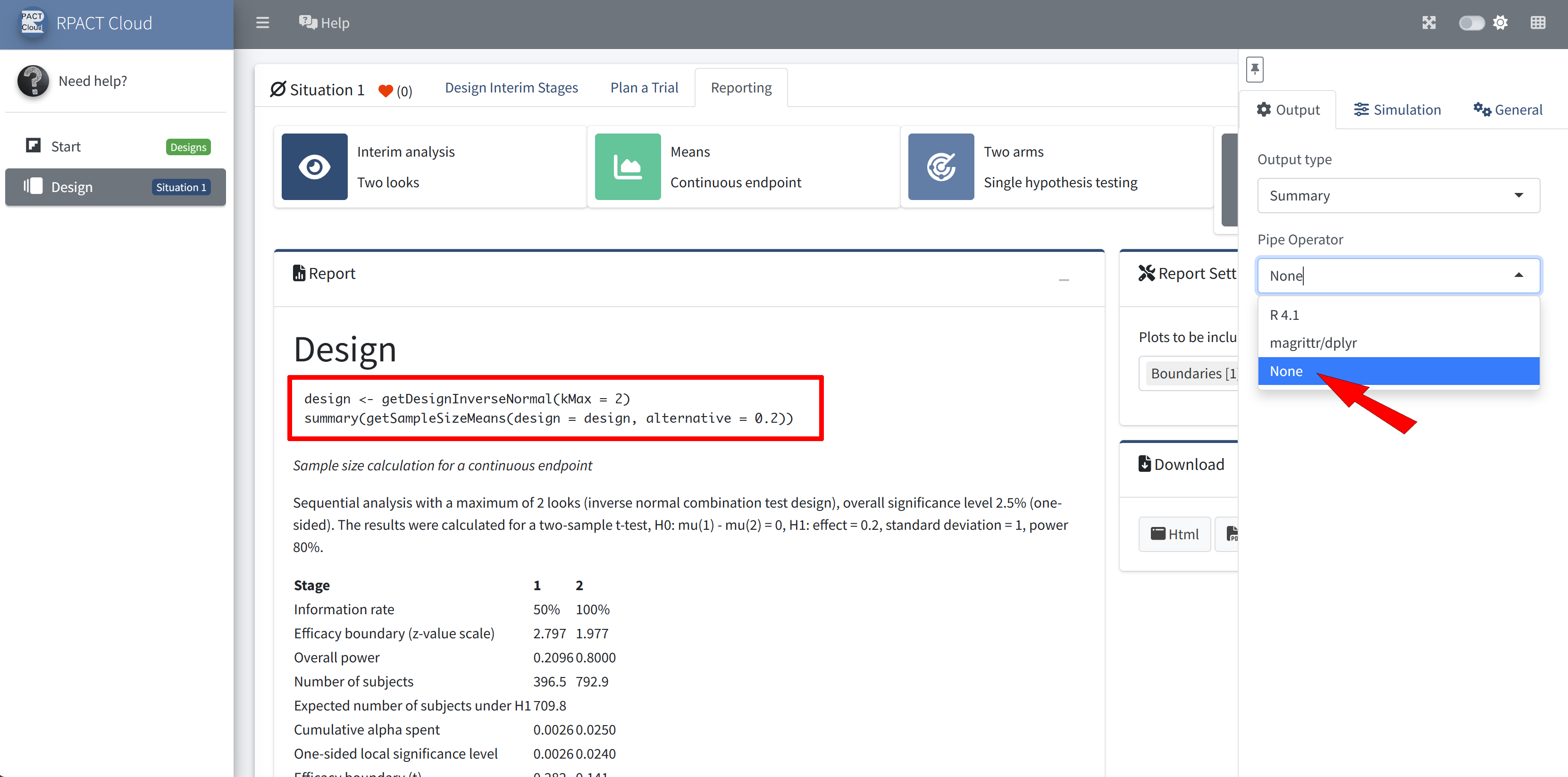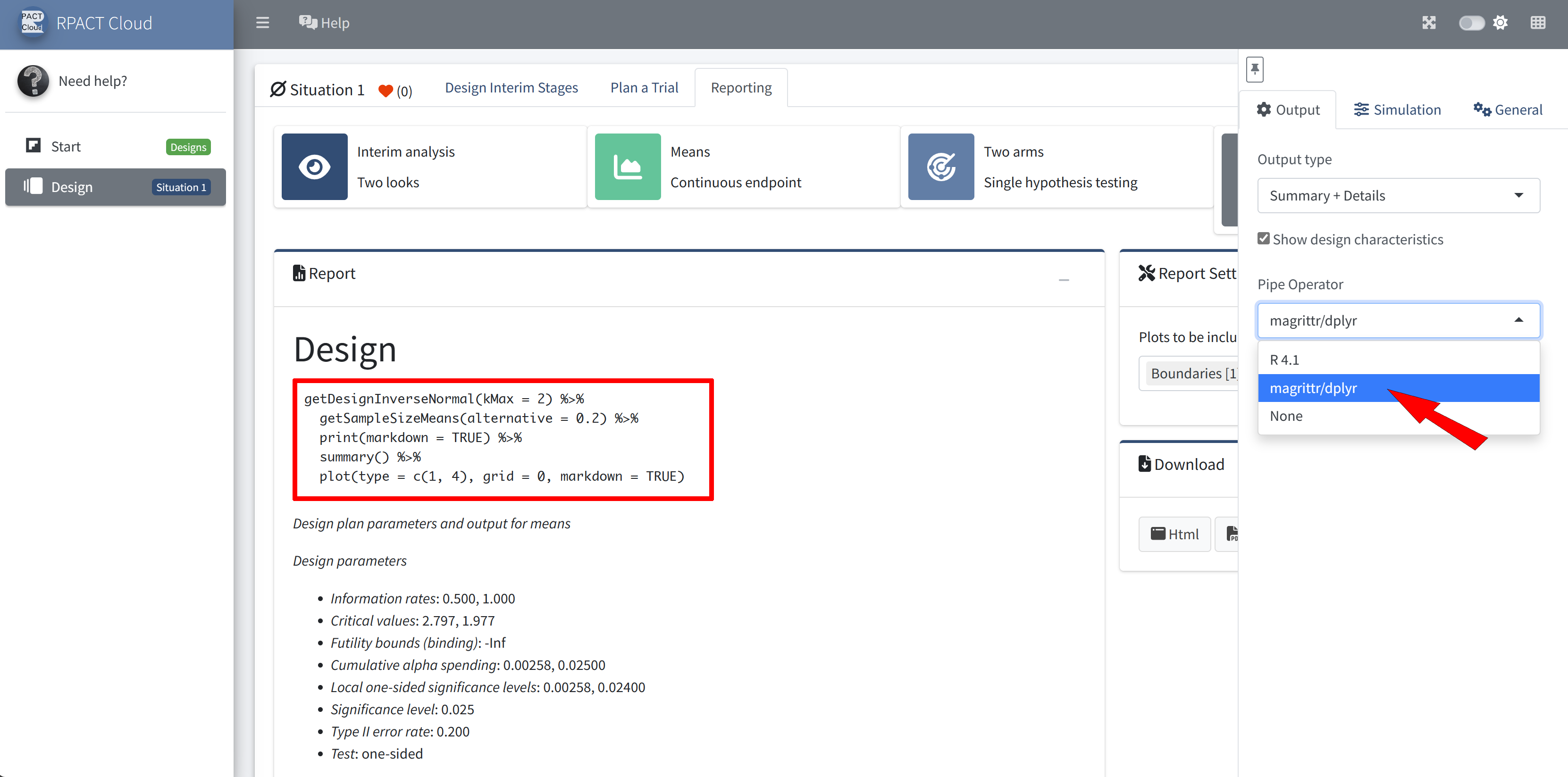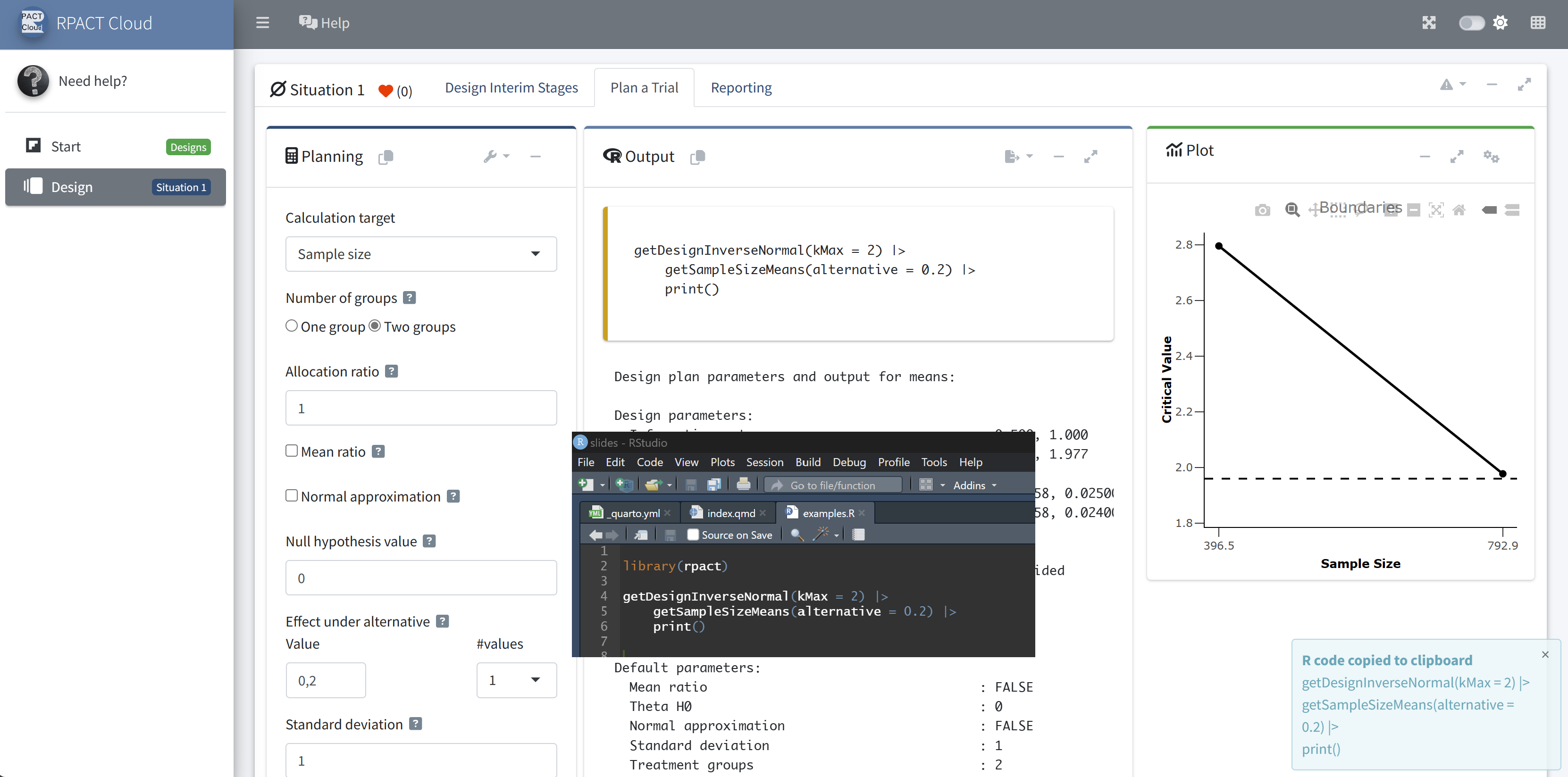 - Code-based: RPACT Cloud produces R code that can be exported as part of reports, and can then be fully transparently version-controlled, reviewed and audited, and can be used for regulatory submission purposes