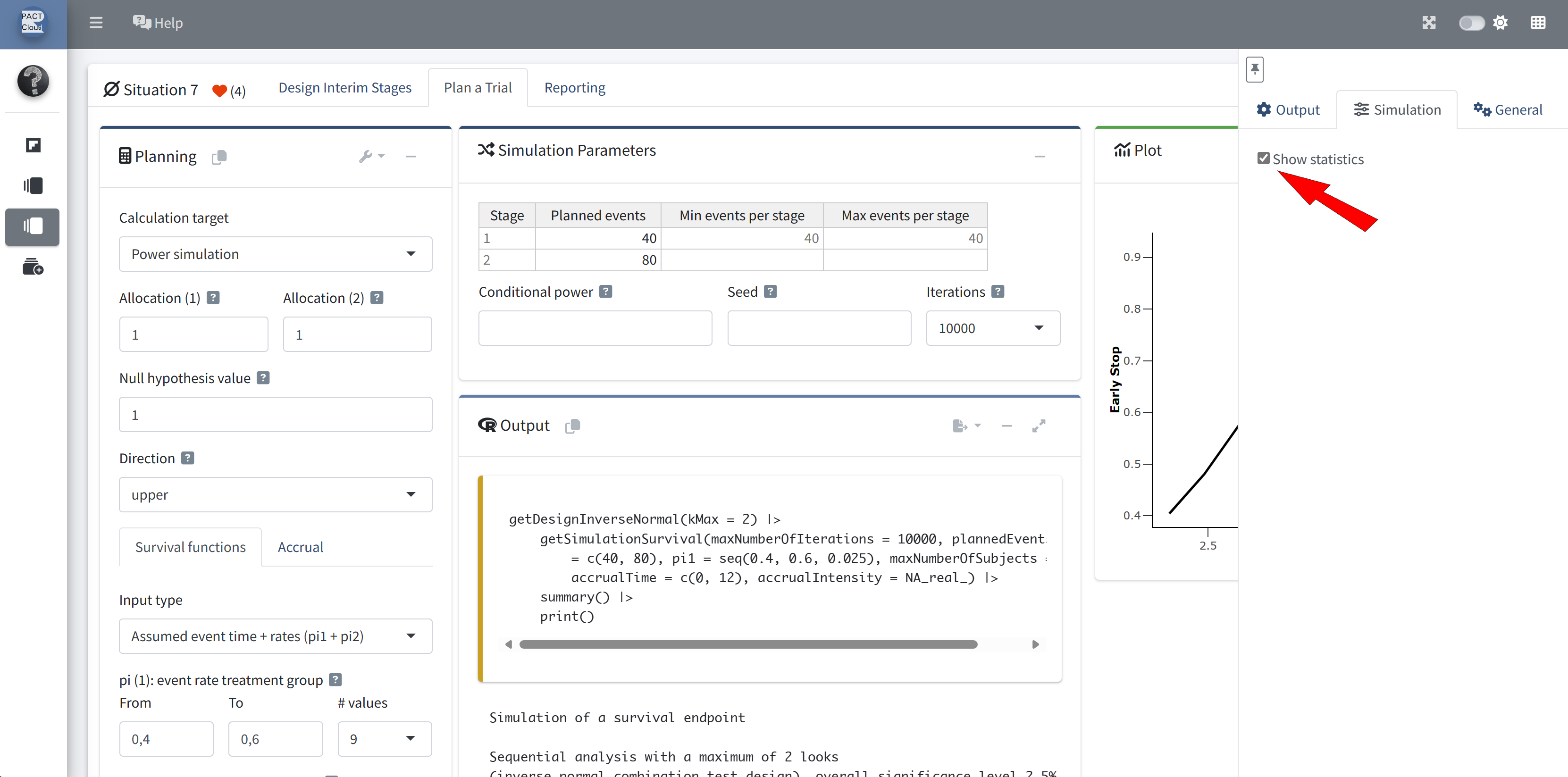 - Yes, sample size re-estimation is supported via conditional power (start via Plan a Trial > Calculation target > Power simulation)